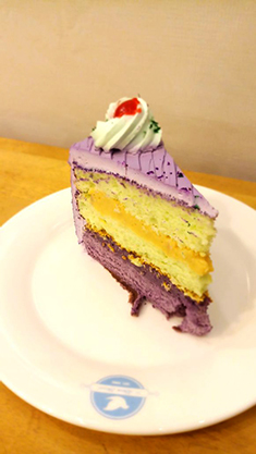A slice of 10DC’s Ube Pandan cake is a coffee flavored soaked spongecake, layered with cream cheese and heavy cream.