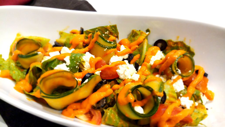 LÁrtisan’s Mediterranean Feta Salad is made from fresh lettuce tossed in red pepper dressing topped with Mediterranean vegetables (zucchini, black olives, and fresh tomatoes) and Feta cheese.